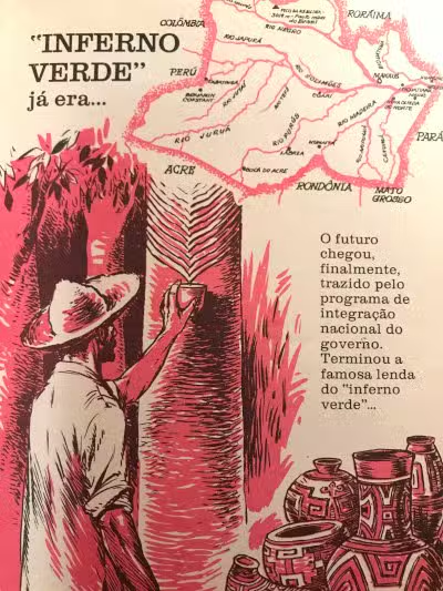 Deforestation in Brazil’s past has depicted the Amazon rainforest as an inferno verde (green hell), a portrayal also used in marketing by the Brazilian government. This historical perspective presents the Amazon as a development challenge during the dictatorship and reflects the current political agenda that views forests as obstacles to development, with the agricultural business that creates laws such as the PL da devastação (devastation bill), which grants authority for companies to do anything to the environment without following any environmental policy.
