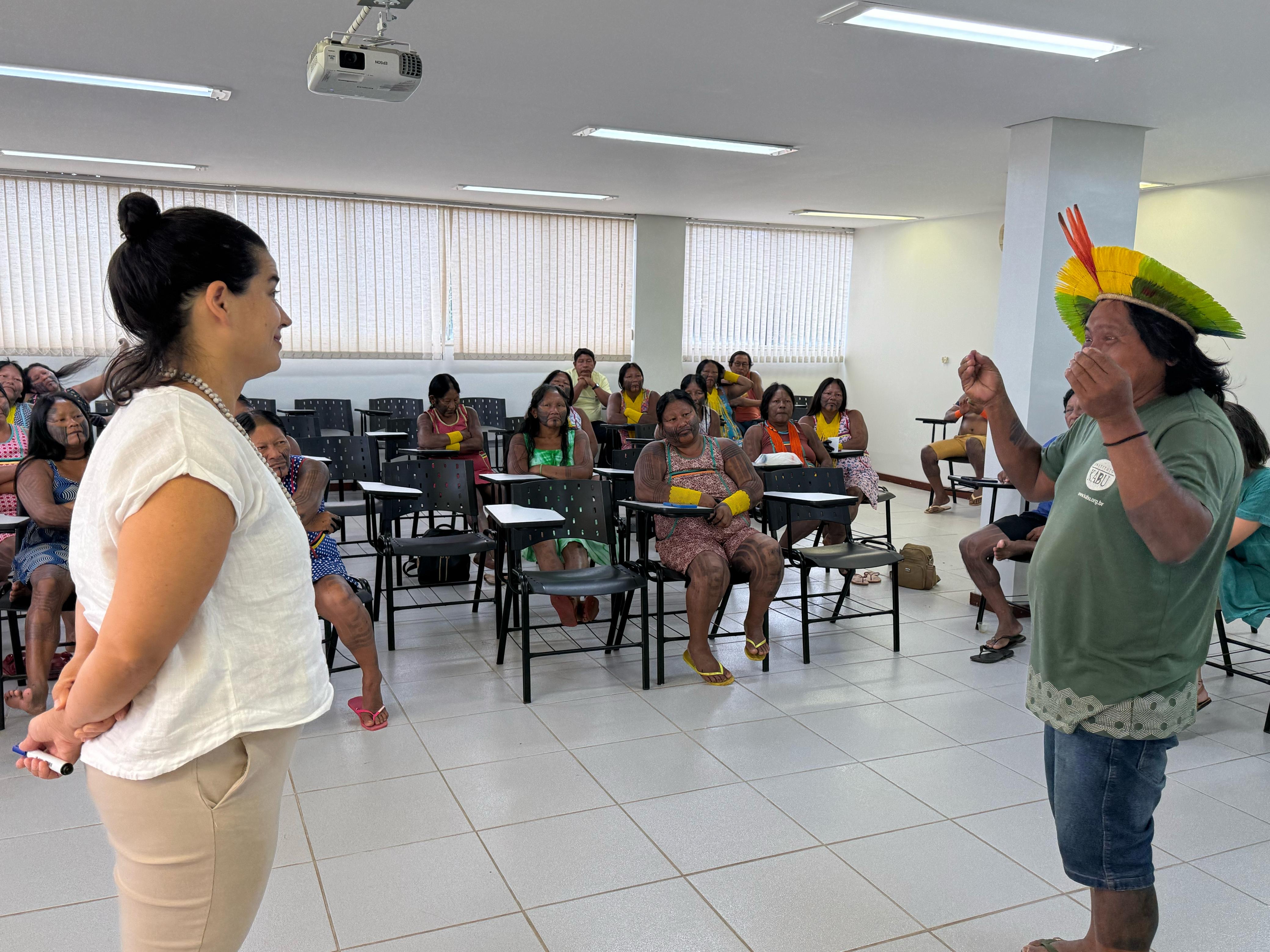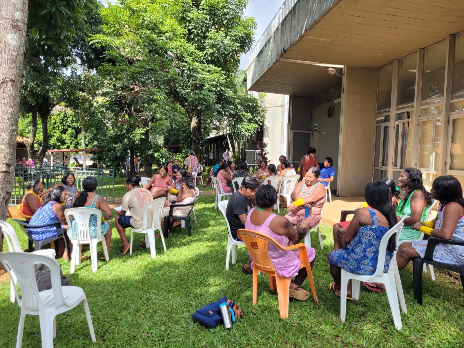 El fin de semana siguiente a ATL, fuimos invitadas a participar en una actividad de capacitación organizada por el Instituto Kabu para el pueblo Indígena Kayapó de los territorios Baú y Menkragnoti. El objetivo de esta invitación era permitir a Veronica abordar el tema del financiamiento climático y a Tchella discutir género y clima. La expectativa era que facilitáramos el compromiso de los pueblos Indígenas con el “mundo” de las COP ofreciendo una traducción digerible de los acrónimos y la lógica que rigen estas reuniones, y así ayudarlos a prepararse para navegar este evento.